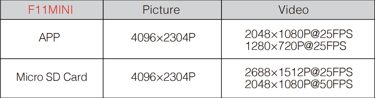 TF card Video Resolution 2688×1512P@25FPS /2048×1080P@50FPS