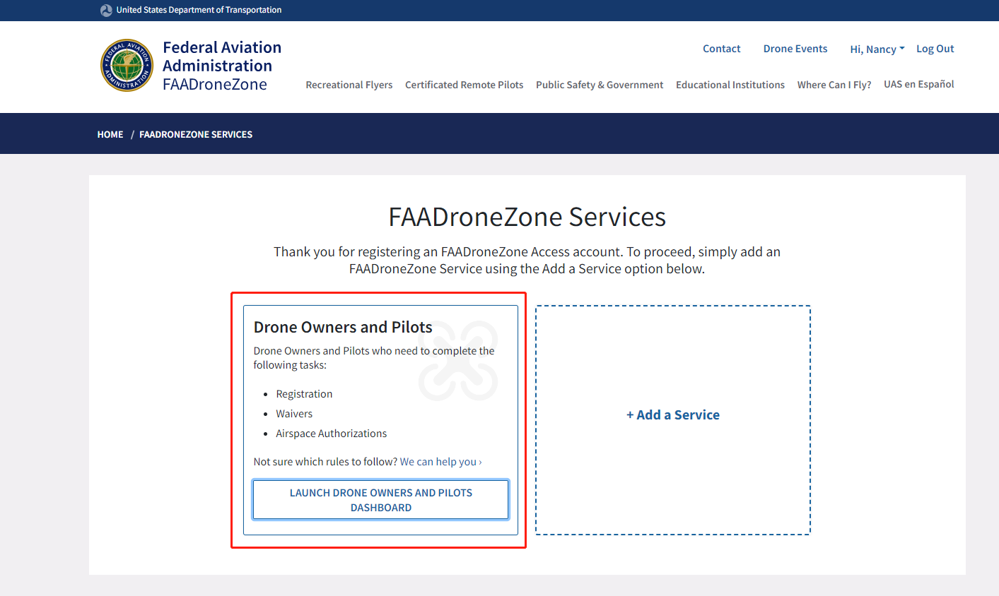When you log in on the FAA DroneZone webpage, the following window will pop up, select "LAUNCH DRONE OWNERS AND PILOTS DASHBOARD"